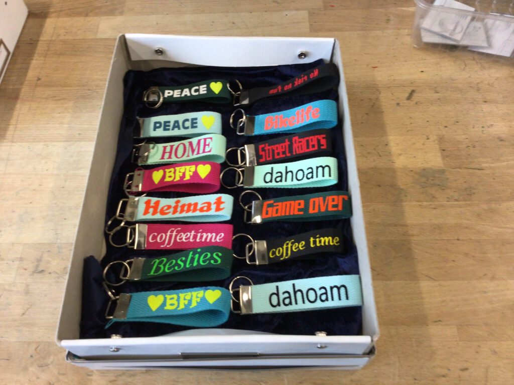 Schlüsselanhänger/Bänder, Armbänder, Weihnachtsdeko und Taschen aus verschiedenen Materialien.