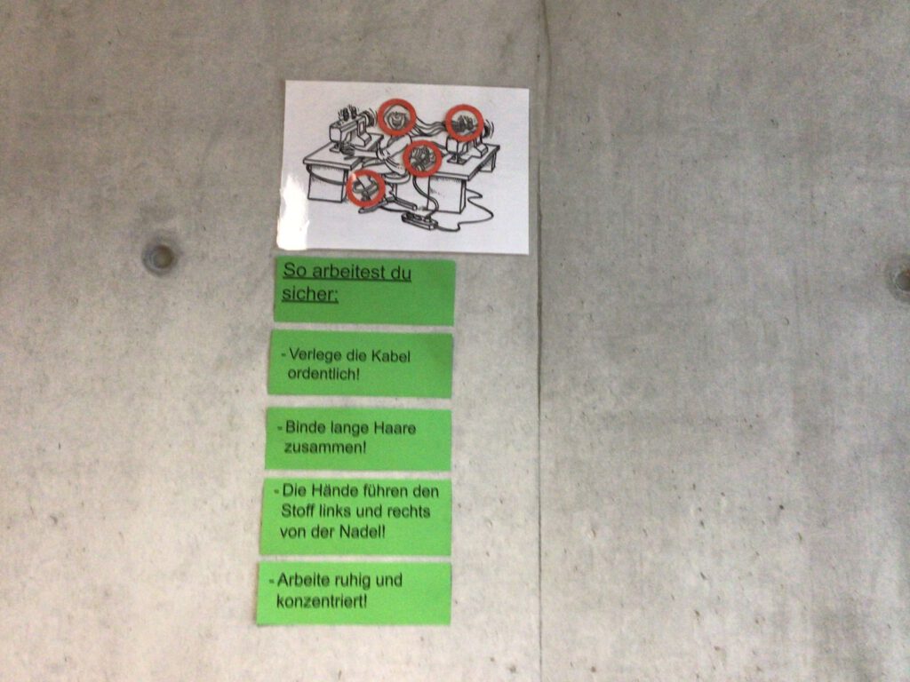 Am besten lange Haare zusammen machen, keinen Quatsch machen, keine langen Sachen wie Schal oder Ähnliches beim Nähen tragen.
