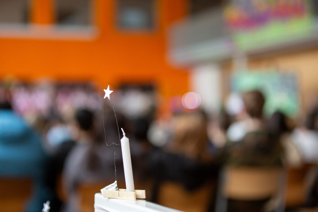 Die Eltern der Kinder, die aufgetreten sind, wurden auch eingeladen. Die Zuschauer waren sehr begeistert und viele haben mitgesungen und mitgeklatscht. Unser Religionslehrer Herr. P hat ein paar Worte zum Thema Weihnachten und Licht gesagt.
