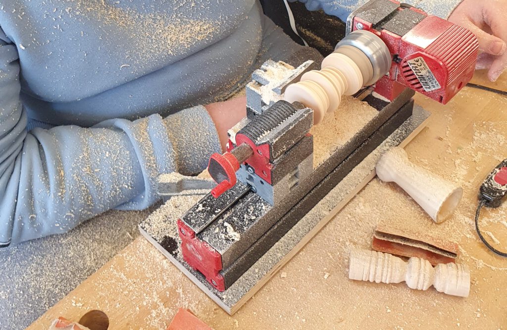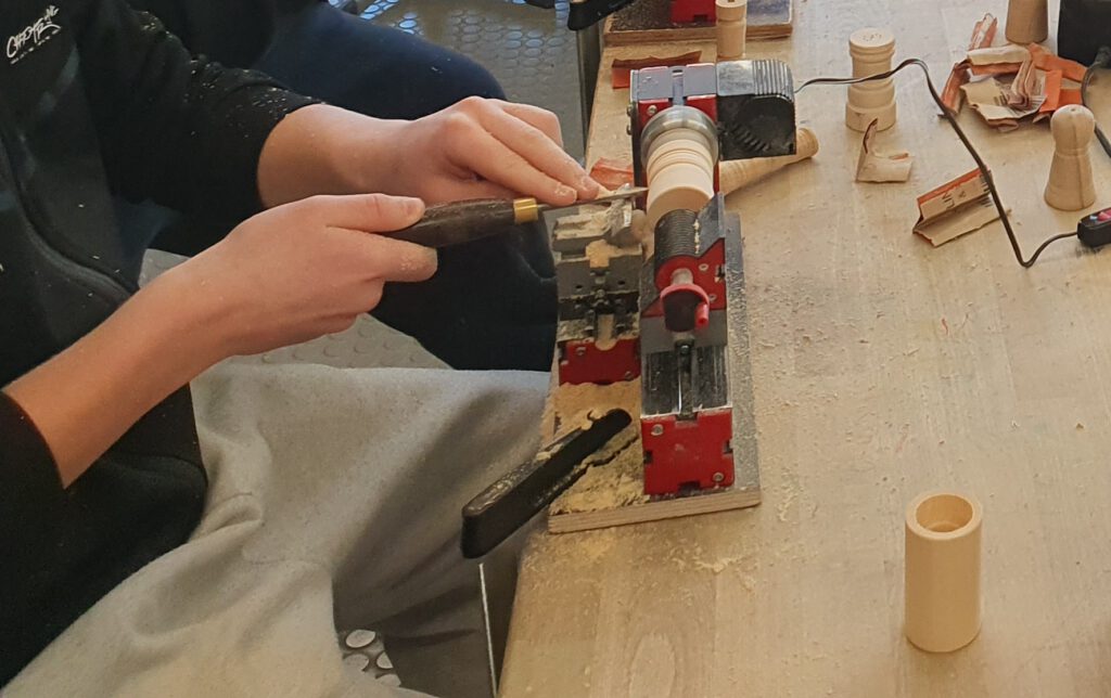 Dazu hat er noch die Werkzeuge und die Drechselbänke mitgebracht und im Werkraum aufgestellt. Zuerst hat er es uns vorgemacht und danach durften wir anfangen.